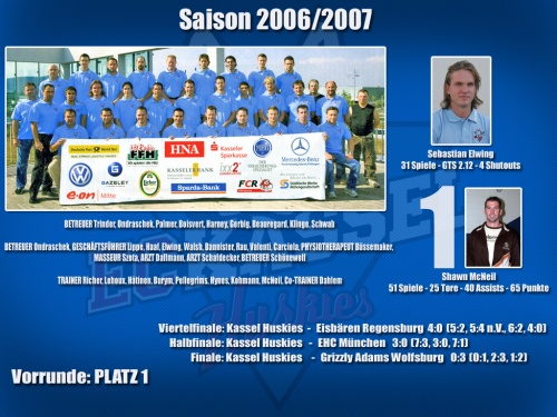 Die Hauptrunde startete für die Kassel Huskies mit einem Paukenschlag - gleich zum Saisonauftakt besiegte man Mitfavoriten Bremerhaven locker und lässig in eigener Halle mit 3:0. Der sonst immer sparsam scorende Guy Lehoux hatte seine Farben mit einem seiner seltenen Treffer in Führung geschossen und die Mission "Wiederaufstieg" offiziell gestartet. Zwar zeigte man gerade im Beginn der Saison noch vereinzelte Schwächen im Zusammenspiel doch bereits im ersten Monat der Serie konnte die Tabellenführung erreicht werden. Für viele überraschend vertraute Chefcoach Richer bereits zu Saisonbeginn auf die Fähigkeiten von Huskies-Eigengewächs Manuel Klinge. Den ließ er seit Saisonbeginn neben den erfahrenen Ausländern Hugo Boisvert und Shawn McNeil stürmen - ein Glücksgriff wie sich am Ende der Saison herausstellen sollte. Wie bereits erwähnt dominierten die Huskies die Statistiken der Liga ebenso wie die Gegner. Lediglich die Duelle mit den Grizzly Adams Wolfsburg sorgten für Spannung und Spaß. Zwar verloren die Huskies beide Heimspiele gegen die VW-Städter - in den Spielen in der frisch eingeweihten EisArena in Wolfsburg waren die Huskies aber tonangebend. Vor allem am 27.Spieltag erwischten die Huskies einen Sahnetag. Beim 8:1 Auswärtserfolg bei den Grizzly Adams punktete Shootingstar Klinge vierfach und brachte sein Team bereits in der ersten Spielminute auf die Siegerstraße. Die Party für die zahlreich mitgereisten Huskiesfans war perfekt. Das einzige Team gegen die die Huskies dreimal das Eis als Verlierer verließen waren die sonst eher enttäuschenden Eisbären aus Regensburg. Selbst beim Happytrain im Februar 2007 setzte es für die Huskies eine der wenigen Niederlagen, als man in der Donaustadt mit 0:3. Eine wirkliche Schwächephase zeigten die Huskies eigentlich nie - lediglich eine Hand voll schlechter Spiele blieben den Fans in Erinnerung. Darunter mit Sicherheit die herbe 0:6 Klatsche gegen Wolfsburg am 45.Spieltag. Am Ende der Saison standen die Huskies mit einem Punktevorsprung von 13 Punkten auf den Zweiten, die Grizzly Adams Wolfsburg und einer Tordifferenz von +90. 41 Siegen standen 11 Niederlagen entgegen.